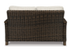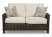 Pretty enough for trendy interiors, yet durable enough to weather the elements, the Paradise Trail outdoor loveseat rises to the challenge beautifully. Handwoven resin wicker over rust-proof aluminum merges high style with low maintenance. Rest assured, though the exposed armrests and feet look remarkably like wood, their sturdy aluminum construction is perfectly suited for alfresco living. Plush seat cushions and throw pillows wrapped in high-performing Nuvella® fabric aim to please.